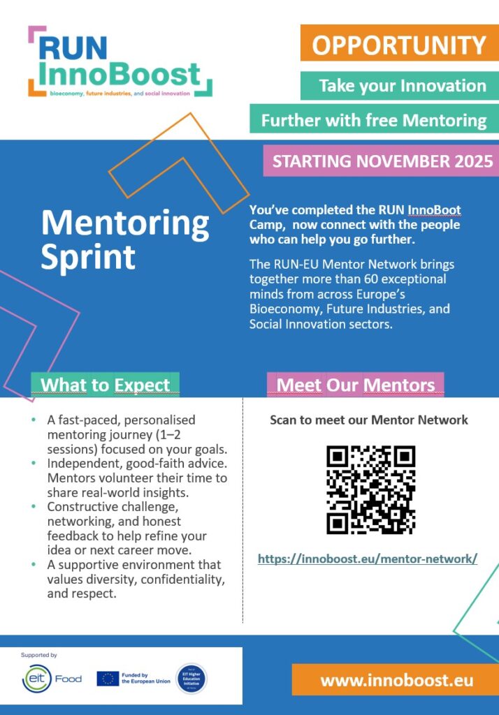 The RUN-EU Mentor Network brings together more than 60 exceptional minds from across Europe’s Bioeconomy, Future Industries, and Social Innovation sectors.  Our RUN InnoBoost Mentoring Sprint is designed for participants who have completed the RUN InnoBoot Camp and are ready /getting ready to turn their ideas, research, or early-stage ventures into real-world solutions.