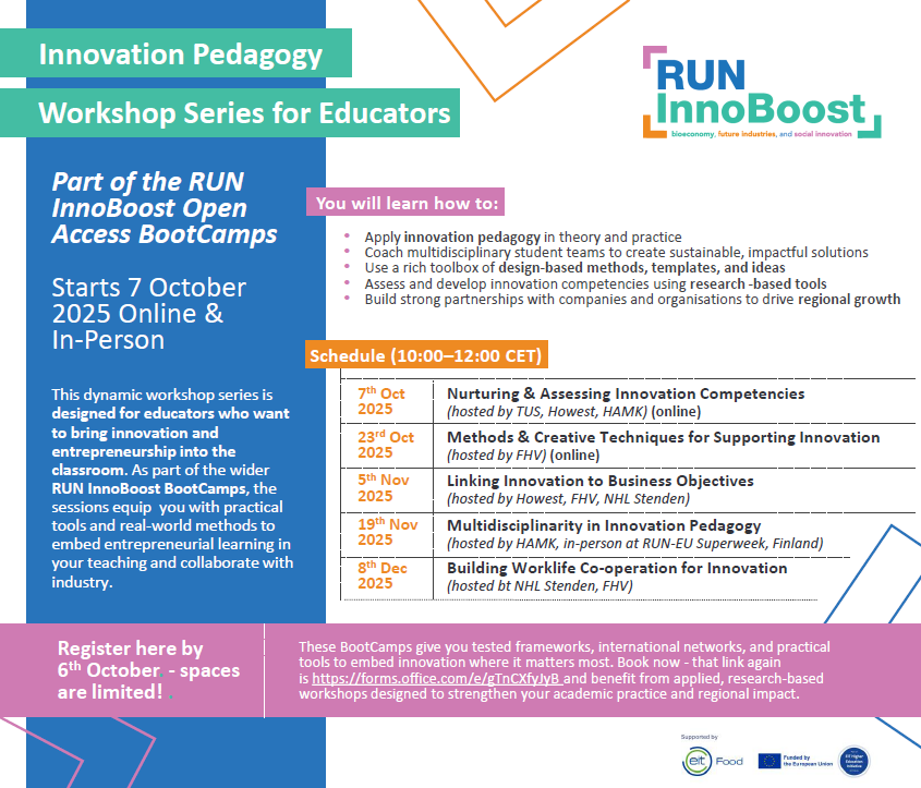This dynamic workshop series is designed for educators who want to bring innovation and entrepreneurship into the classroom. As part of the wider RUN InnoBoost BootCamps, the sessions equip you with practical tools and real-world methods to embed entrepreneurial learning in your teaching and collaborate with industry.